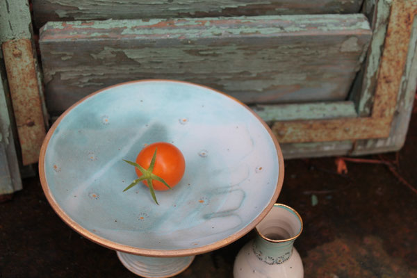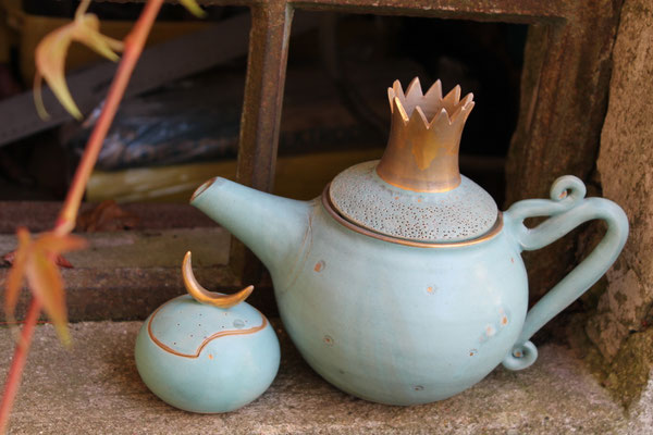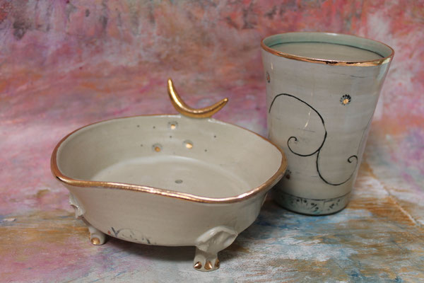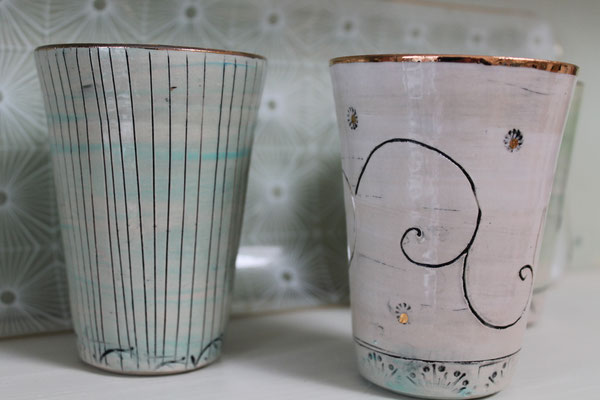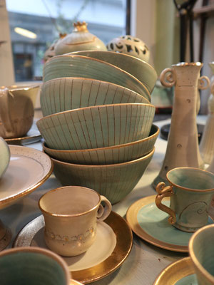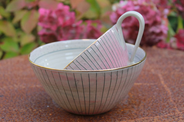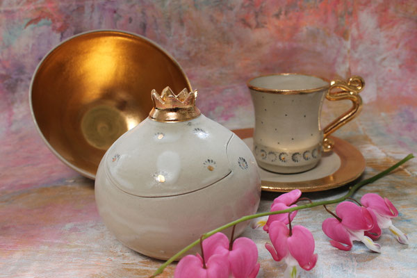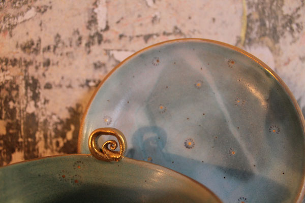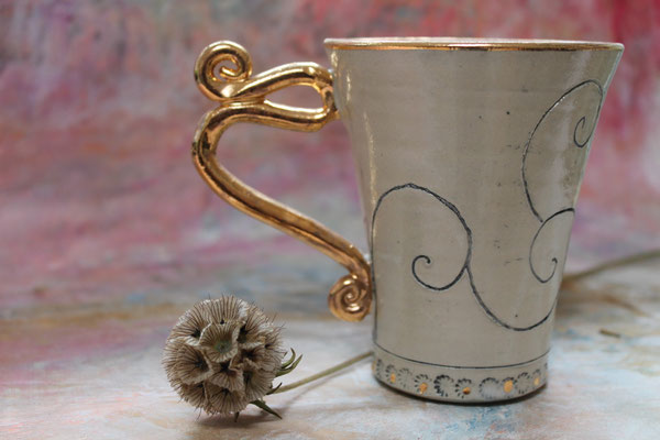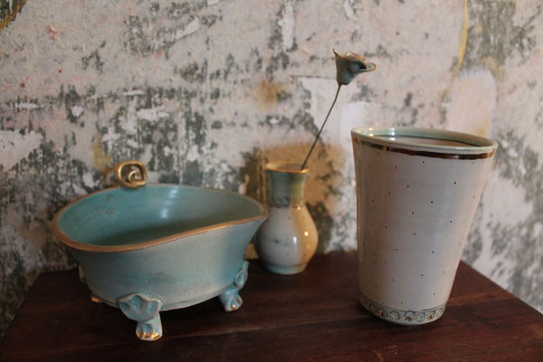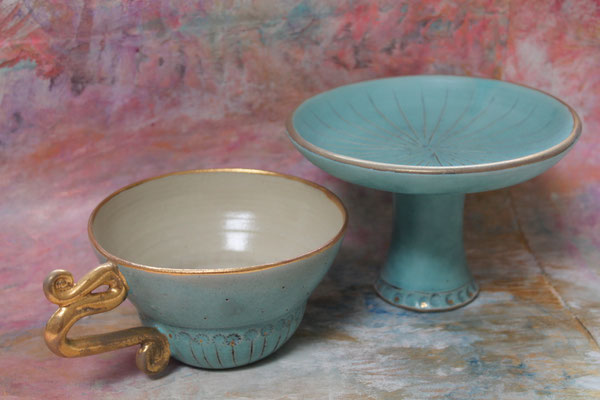 Ich arbeite mit Steinzeugton aus dem Westerwald und brenne den Glattbrand bei 1240 Grad. Zur Veredelung verziere ich die Keramik mit echtem Gold, das im dritten Brennprozess eingebrannt wird. Meine Keramik ist spülmaschinenfest aber nicht für die Mikrowelle geeignet.